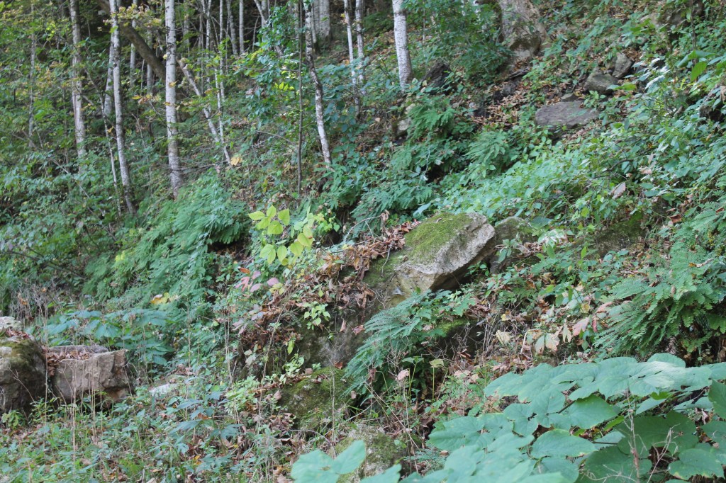 The trail slopes uphill, gradually climbing the bluff. The undergrowth is still vibrant; I wonder, is it more dense in the spring? We stepped around a limestone rock protruding from the ground, encased in dark green moss. The tree spacing in this area lets the sunlight almost flood the floor. A few tall, older trees. The trail begins to curve around the bluff, and up. A large limestone boulder rests on the hillside above us, nestled among trees. Its sedimentary layers are evident.