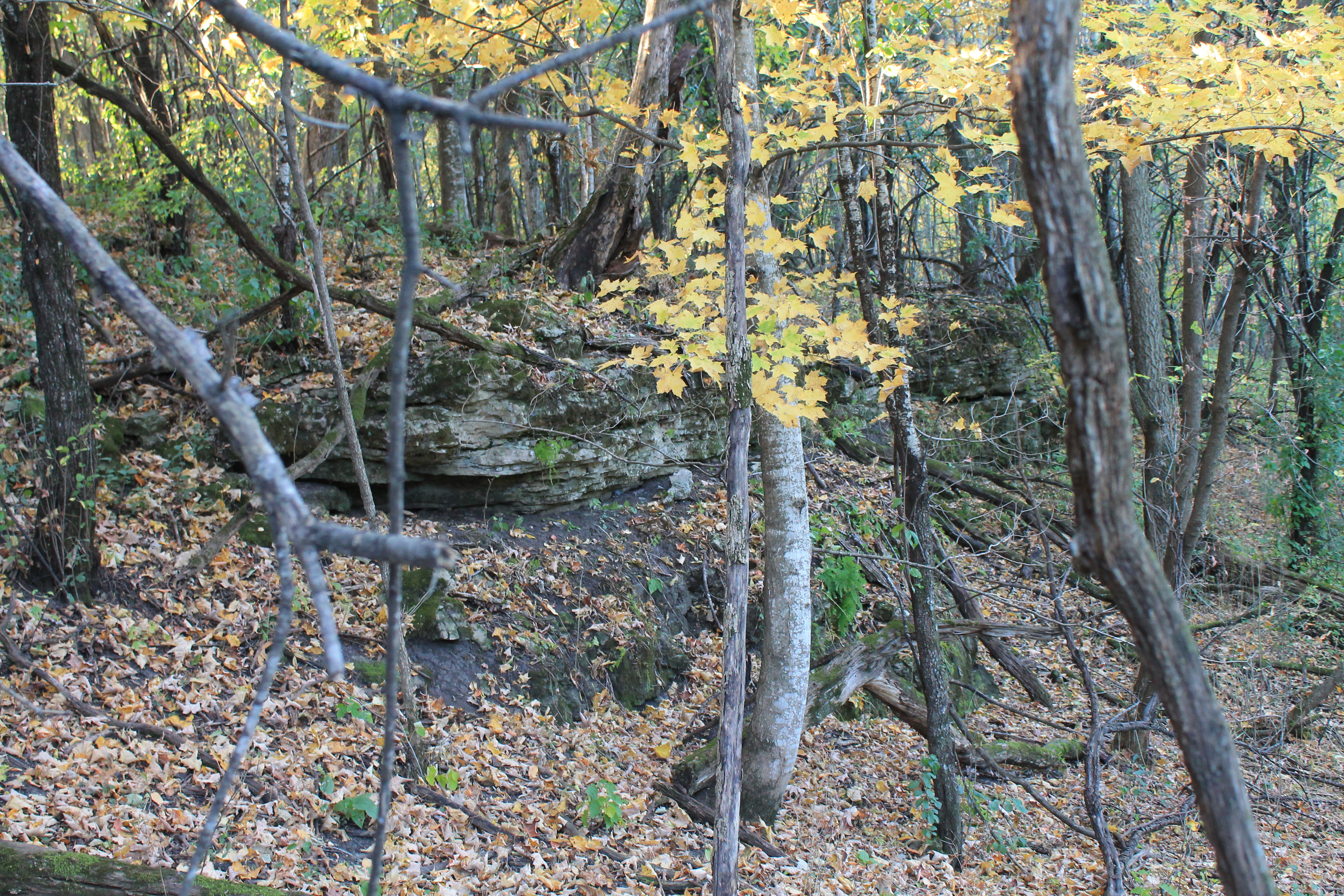 Arriving at the edge of the field, I dropped down, literally on my belly to crawl under the fence. The ground is terrifyingly dry; these perfect autumn days are nice but I hope the drought ends soon. Gopher mounds piled along the fence. I waded across the narrow pasture strip, the grass still long and thick despite the drought. Squatting, I crawled under the barbed wire fence separating the pasture from the woods. A break in the buckthorn granted my passage. I ducked under clawing branches. The late afternoon soon filtered through the leaves and tree trunks. I paused to admire a spider web. A deer crashed through the thick underbrush somewhere below. I stood upon a huge drop off.