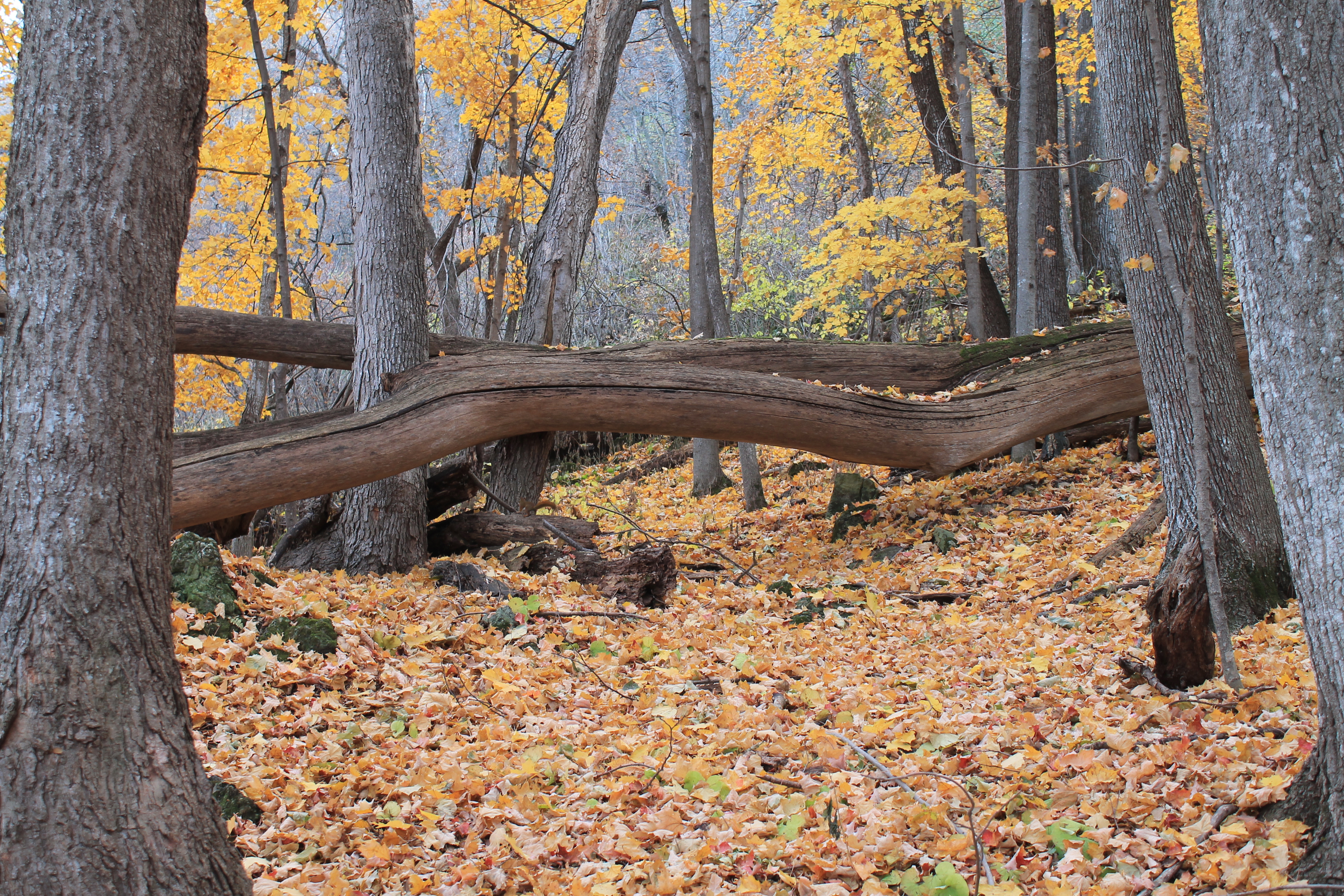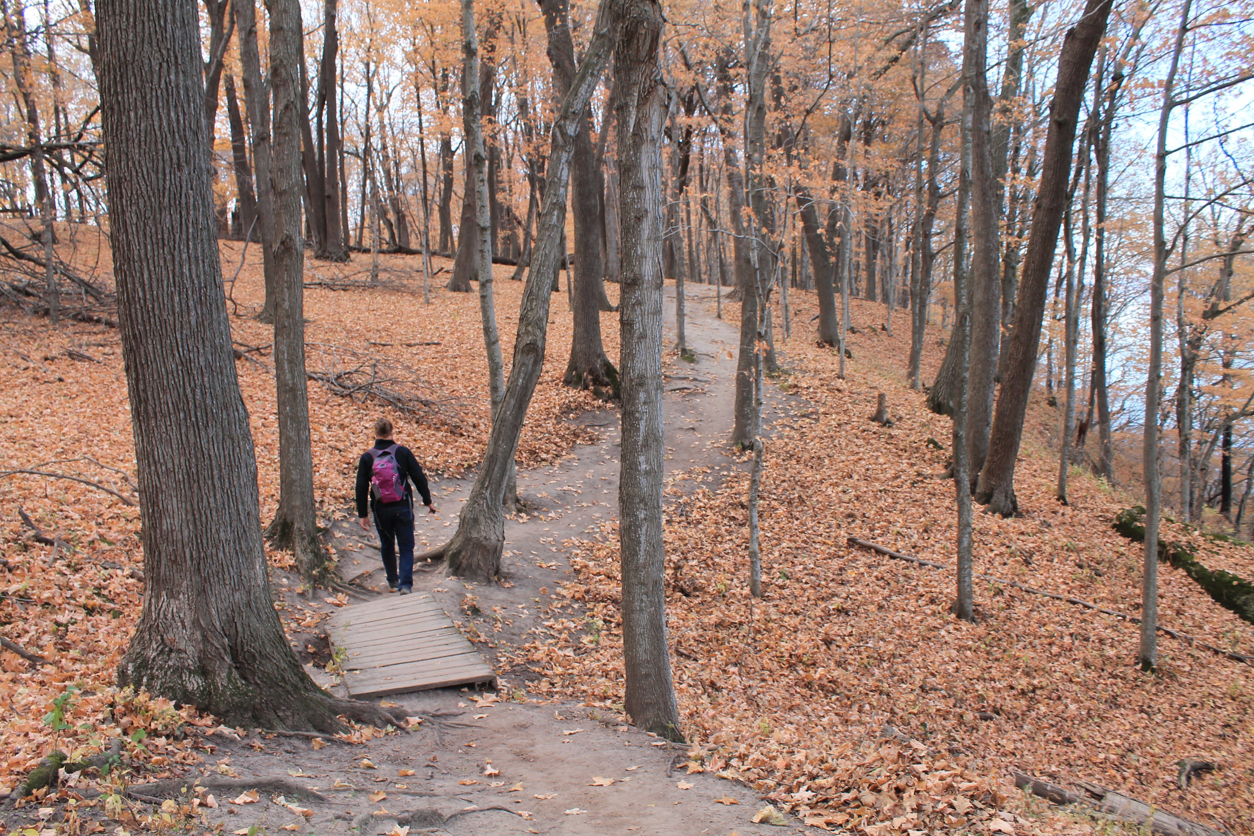 We walked across the top of the bluff on an asphalt trail, under a canopy of tree branches. The forest is golden. Leaves litter the path. The elegant beauty of paper birches takes my breath away. We could glimpse Lake Pepin down below us, through the trees. Frontenac State Park abuts Lake Pepin, encompassing bluffland, prairie, floodplain forest, and upland hardwood forest. With such diverse habitat, including the river, the park has recorded 260 species of birds. The bluff provides spectacular views of the lake. I have only been to Frontenac twice, both times in the autumn and it’s stunning. It is open under the trees. Both the ground and remaining canopy is aflame. Maples appeared to be the most numerous trees. We left the asphalt behind for a dirt trail, but it was still wide and easy. Jesse led the way and I often had to nearly run to catch up to him; I am much slower anyway but my camera slowed me down more. (I had to refrain from taking too many photos.) And there were a couple of trees I stopped to touch. I can’t describe how beautiful it was nor how it made my heart soar. Several places along the edge of the bluff stood rock outcroppings. Minnesota was covered by shallow seas, hundreds of millions of years ago. Sediment and lime deposits from organisms accumulated at the bottom of the seas and slowly hardened into rock, which now makes up these bluffs. Fallen trees lie here and there. Several places there were teepees made of fallen branches, which made me smile – my brothers and I built similar structures and spent many hours in blissful play in and around them. The sunlight illuminated the top of the bluff perfectly. A wooden staircase leads further up the bluff to campsites.