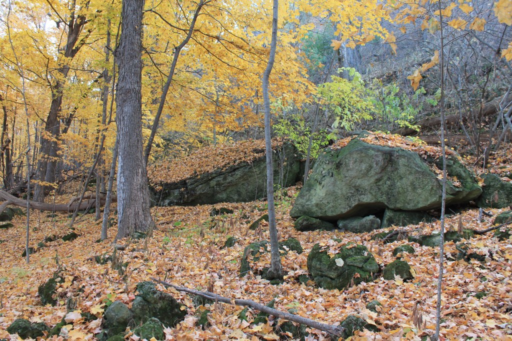 We continued onward, Jesse at a much faster pace than me, the trail beginning to take us down the bluff. Jesse was a bit below me. Now, I could see the hole in In-Yan-Teopa; it looked like a doorway – would it take me to Narnia? We heard something clatter on the bluff above us, on the other side of the trail, rocks skipped downhill. What had knocked rocks down? (Jesse being dramatic and not at all serious, thought it was a landslide.) I put the 300mm lens back on the camera and scanned the side of the bluff. A white-tailed deer, a doe. She was facing away – I waited to see if she would turn and she did just a very little. Such elegant and beautiful creatures. I marveled at her spindly legs that somehow are full of grace. I was awed by the grand scale of the bluff. The way down becomes steep quickly, even going down is challenging. Jesse commented that the further down we go, the more we have to go back up. We passed piles of moss covered rocks of various sizes. The path down became narrow. The trail wound its way down the hill. I loved the appearance of the slabs of stones making steps – lent a fairytale feel. Maidenhair ferns grew among the scree. Then we went down a steep, wooden staircase. The trail took us along, no longer down the bluff. I looked back up, we’d come down so far and were still aways from the bottom and the water. Dirt path, as it leveled out, then stone steps again, and back to dirt path – rocks here and there, sometimes causing me to stumble. Wonderstruck, I delighted in the trees and rocks. An oak tree’s orange leaves caught my notice. Jesse was out of sight. I could see the blue of the water through the trees. The deep, dark green of the moss contrasted brilliantly with the golden leaves. Jesse came into view again, waiting on a bench for me. The maples seemed to be marching down the bluff, or were they coming up? Jesse turned left, taking us down again. Another set of wooden stairs, not quite as steep as the last. Several more feet and down a steep staircase. We arrived on the shore of Lake Pepin. Boulders were scattered about. Jesse sat on a log to read. I tried to write. One boulder was riddled with holes, like a sponge. (Wish i knew how that happened.)