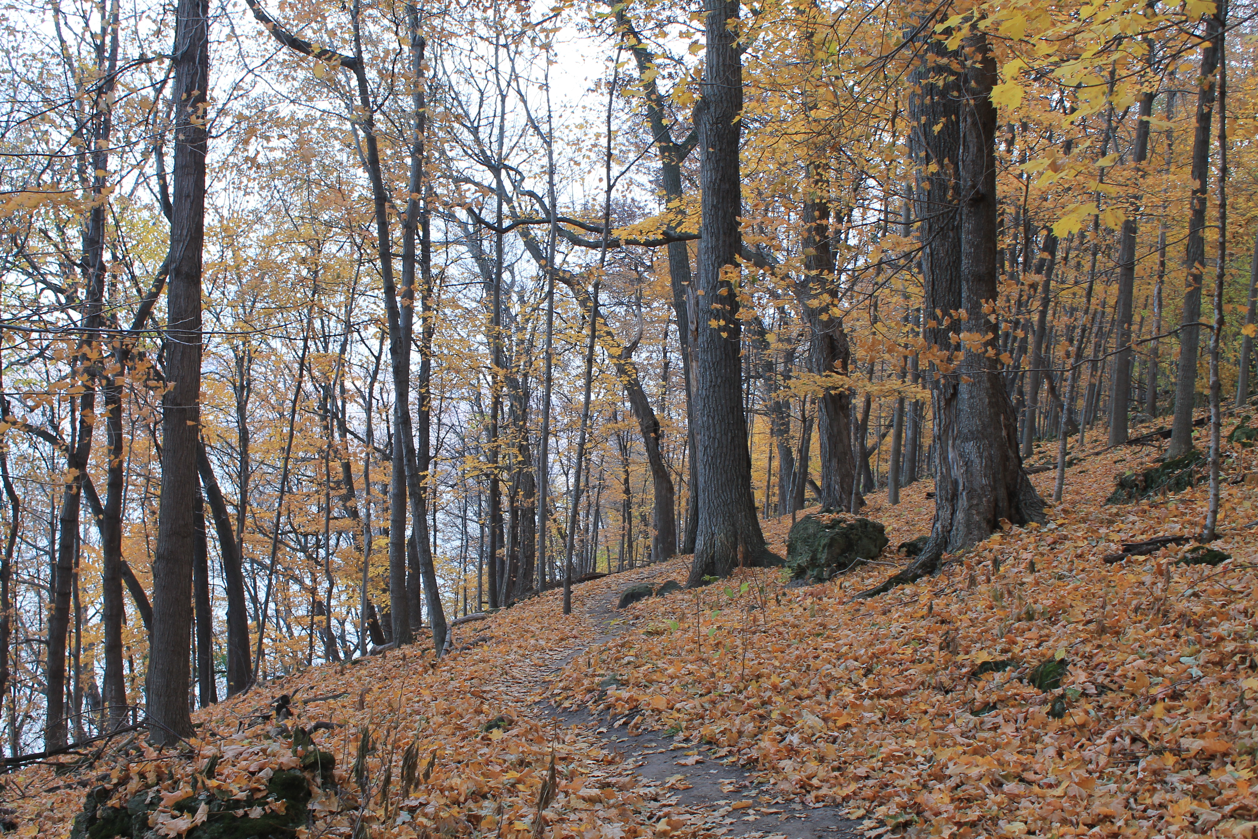 Small, quiet tinkling fills the air as the river licks gently the foot of the bluff. Gulls cry out, transporting us to the sea. The sound of tissue paper being crinkled drifts down the bluffside as frantic gray squirrels rustle and dig in the leaf litter, sometimes chattering. Except for the hideous vehicle noises drifting over the river from Wisconsin, it is calm and quiet. What are the gulls saying? A leaf silently floated down off a tree. Maples light the bluffside, golden, a blaze like sunshine. I became lost, watching a gray squirrel flit about. A bluejay cackles somewhere above. The hike down was beautiful and invigorating; the hike back up will be arduous and exhausting. A gull flew low, dipping its feet into the water, perhaps snatching something. A few more leaves float down and crash to the ground. Frontenac is a lovely place. The path is at first a winding paved trail, with some ups and downs, going with ease across the top of the bluff. For a moment it rains maple leaves. While almost too hot on the hike, I am beginning to get too cold.