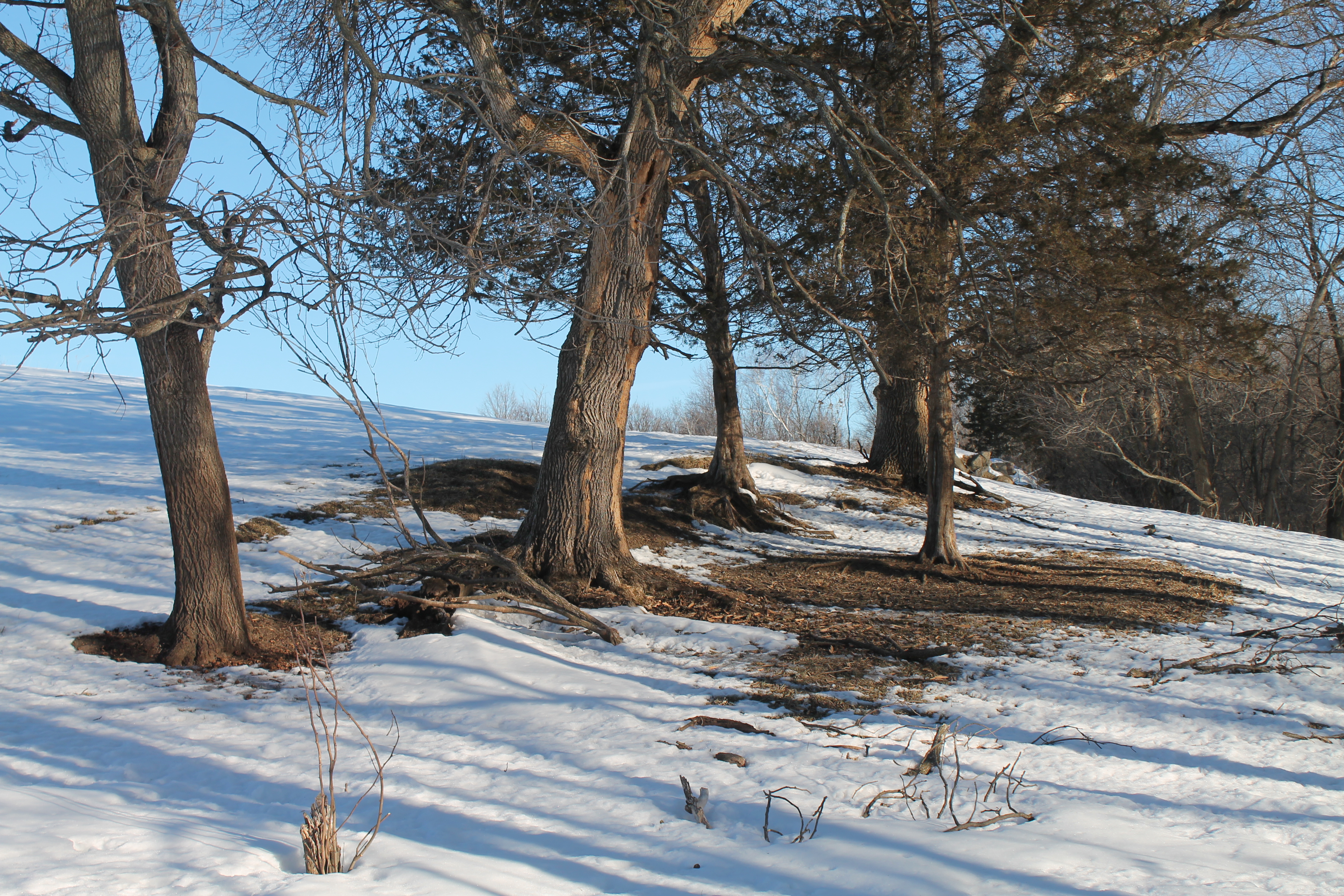Coyote tracks lead along the exposed bedrock. I follow, intrigued, ducking under fallen trees. Does the coyote have a den under the rock? I was unable to answer. I came to an old, rusty woven-wire fence – strange to think this steep hillside was grazed at one point. I tried to climb up onto the rocks here but couldn’t get a hold on anything solid in which to pull myself up. I turned around, still taking in the coyote tracks. I found an easier spot to climb up. Weaving my way through the trees, I continued up the slope to the single barbed wire fence. I dropped to my hands and knees, and crawled under. I observed coyote tracks inside my snowshoe tracks from last week. I followed my previous tracks along the fence line. Turning right, down the slope, past the walnuts, the boxelders and ash, up the slope near the tiny cedar, and along the pasture lane. I stepped over a couple of gates and then I was back in the yard. A couple of my nieces, visiting from Texas, were playing in the snow.