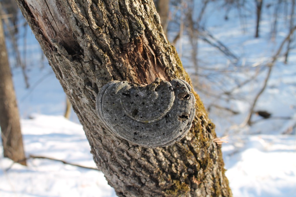 I walked further downhill, well below the rock outcropping. Another ravine blocked my path, again, I scooted down on my backside. Ambling up the other side required effort but was still pleasant. (As soon as I entered the woods I could no longer feel the wind and was sweating by now.) I had to be mindful of each step, dead trees, logs littered the ground and I didn’t want to damage my snowshoes. A tree full of fan-shaped fungus drew my attention, possibly turkey tails. It is beautiful. Like butterflies resting on a tree. A tree grows horizontally; at some point, I would like to walk its length, but currently it is frosted in several inches of snow. I gaze upward into the bare tree limbs, an incredibly blue sky fills in the gaps between the scraggly branches. I am near another rock outcrop. I take a moment to touch and observe the scaly but beautiful bark of a black cherry tree.