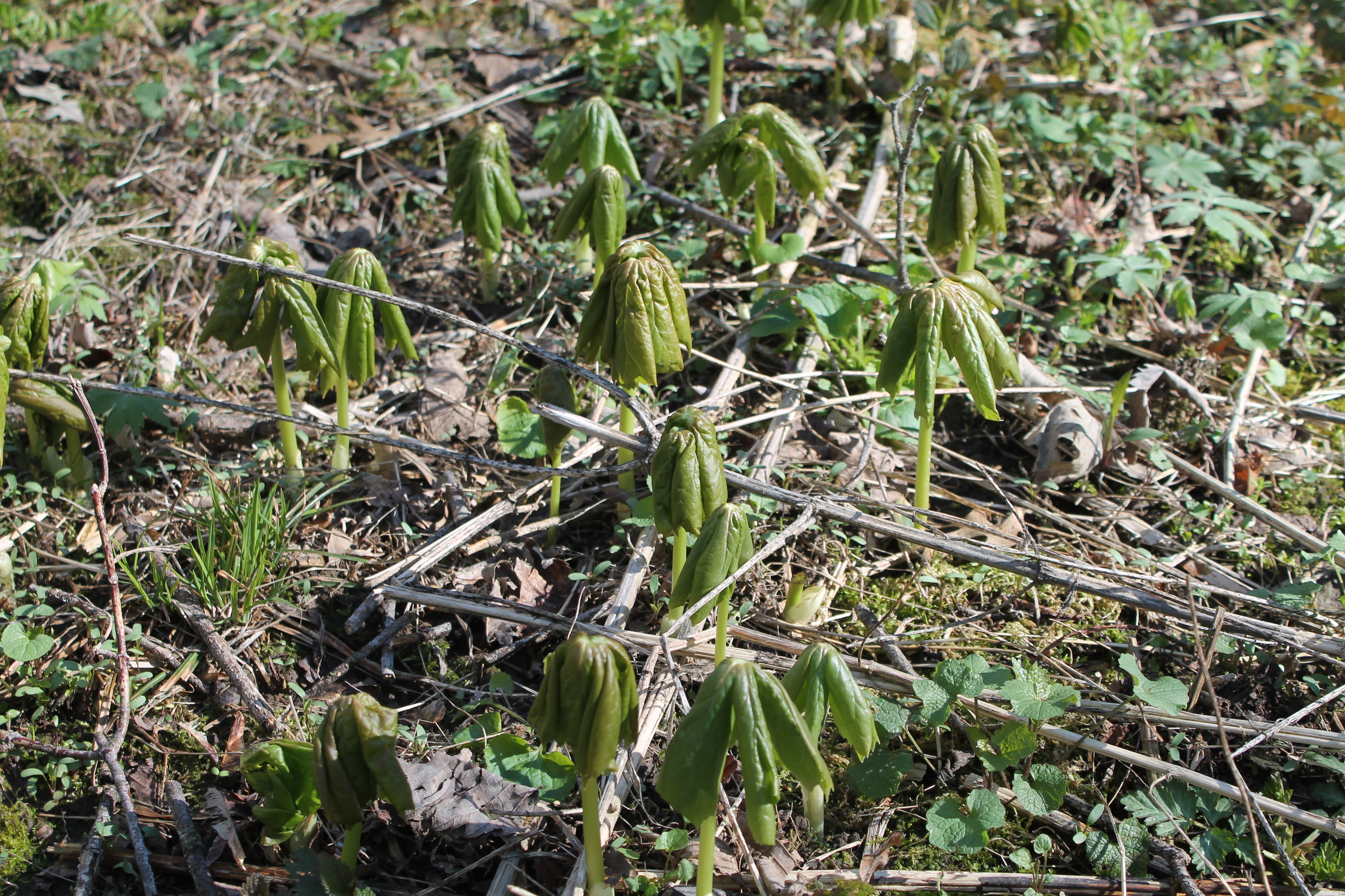 The steep bluffs grew taller and taller on either side, the farther onward I moseyed. In some places the valley in the middle of them was quite open – grasses, sedges, wild parsnip and garlic mustard thrived in these areas, greening the landscape. Down and up another ravine, around a leaning boxelder tree, and over several logs, I arrived at the magic spot where the emerald umbrella plants clustered. – This is the only spot I have seen them so far. They are beginning to open up. I wonder what they are – they aren’t in my wildflower field guide. But they are so fascinating with their umbrella leaves and thick, nearly translucent stalks. There are grass, violet plants, garlic mustard and waterleaf tucked in among them. Moss grows at their feet. I look straight down on one, which is open the furthest, almost star-like in shape from this perspective. I stepped carefully around the umbrella patch, ducked under a low-hanging branch, and halted at the temporary waterway, its banks muddy. I took several steps to my right, and out onto stones in the waterway and across. Then I ambled up the bank, and followed a deer track. I walked along, on top of a log, using it to get further up the bluff side. I jumped down and climbed a little more before reaching my tree bridge. I crawled up onto my bridge and sauntered across, enjoying the elevated perspective. Getting down on the other side took more care so as not to fall. By going along the east side of the waterway, I avoided a thick patch of brambles, which would have been unpleasant to wade through. Green was pushing its way up through last year’s dead vegetation. The trees cast shadows across the valley. I took in some of the plants at my feet, wild geranium and perhaps wood nettles or spotted dead nettle.