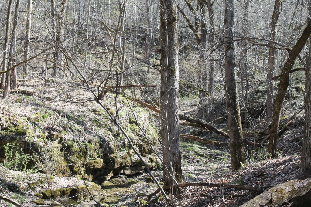 Before the bedrock of my miniature and temporary waterfall, I turned left, and scrambled up the steep slope. – Roughly following my trail from all my earlier walks; going across the hill part way up. Rather than going back down toward my tree bridge, I continued onward, walking several feet below the rock outcroppings. Slowly, meanderingly, I made my way down the slope back to the bottom of the valley, and up it, back to the walnuts. I crawled under the fence and strolled back through the pasture lane.