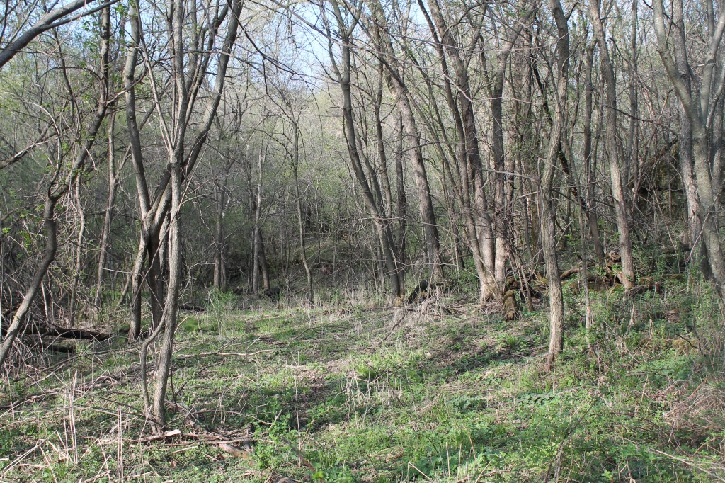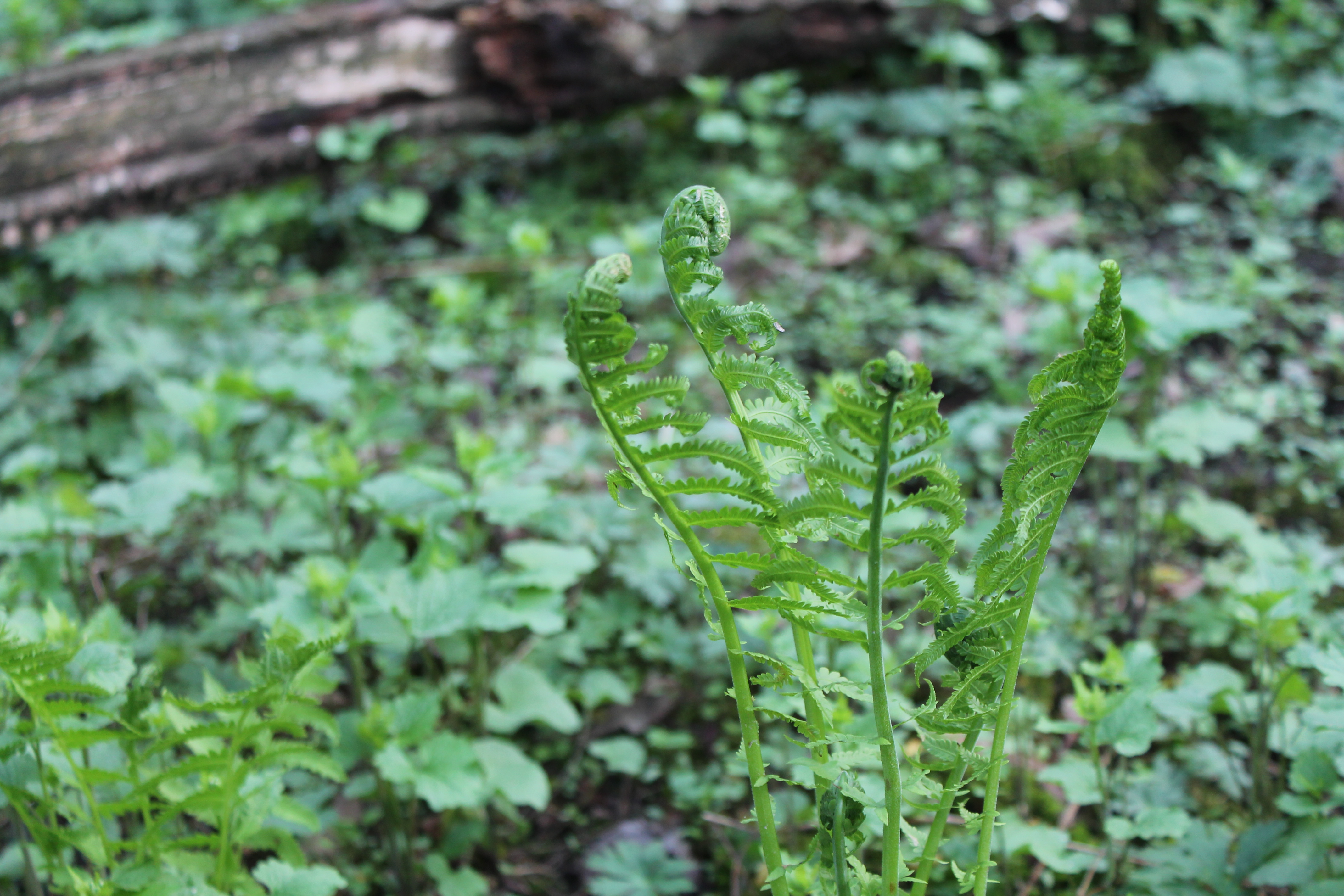Pressing on, I took in the amount of moss covered logs lying on the hillsides and the dead standing trees, this seemed like it would be prime habitat for mushrooms. I heard a noise in the underbrush on the eastern slope, looking up I saw two white flags fleeing, the backsides of white-tailed deer. I saw several more violets in bloom. I crossed the ravine in several places, and came upon the spot with the umbrella plants. I had been paging through an edible plants book and found this plant, a happy accident. They are called mayapples. And should only be eaten when the fruit is fully ripe. (I am not sure I will be trying it; if these are the only plants on the farm I want to leave them for the wild animals. They are less umbrella like now as their leaves are fully open and up. I am so excited that I successfully identified something new to me! The ostrich ferns had grown, perhaps the most significant change in the woods – they were barely visible above the ground a few days ago. Now, they are roughly a foot tall or more and nearly fully unfurled – their fiddlehead nearly gone. My Mom had asked me if I had enough to harvest but they grew too fast. The trees are getting greener but still have a ways to go before their leaves are in full. I hadn’t been in the woods for long before I turned back to the house; I just needed even a brief wander into the woods this evening.