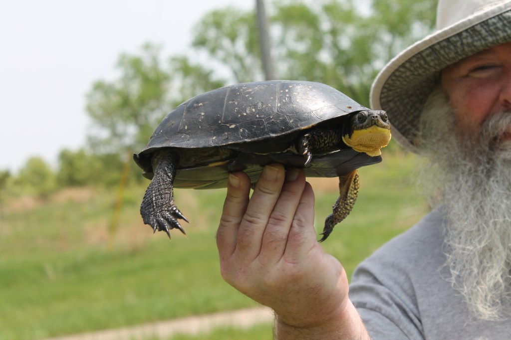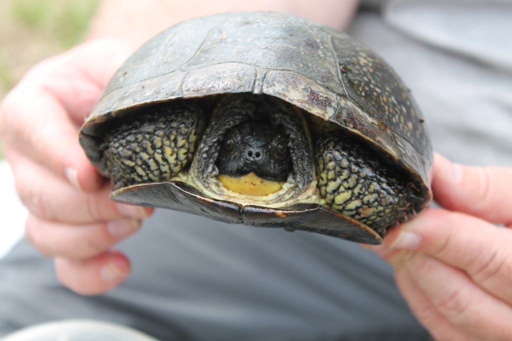 “Okay, why do I always get that mixed up,” Chris said. Remembering which is which can be tricky. But in this case, think about that the male has a concave plastron for ease in mounting a female to mate. His domed carapace had pale yellow flecks. Blanding’s are classified as medium to large turtles with a helmet shaped profile and yellow bars and spots. The bright yellow chin and neck is the easiest way to identify a Blanding’s. He has yellow splotches on his legs too. (Named after William Blanding, a medical doctor and naturalist from Philadelphia.) The scute across the top of his carapace appeared cracked. Jeff set him back down in the bin, he poked his head out of his shell just a little bit. (Jeff had already scanned the turtle for a pit tag, there wasn’t one.)