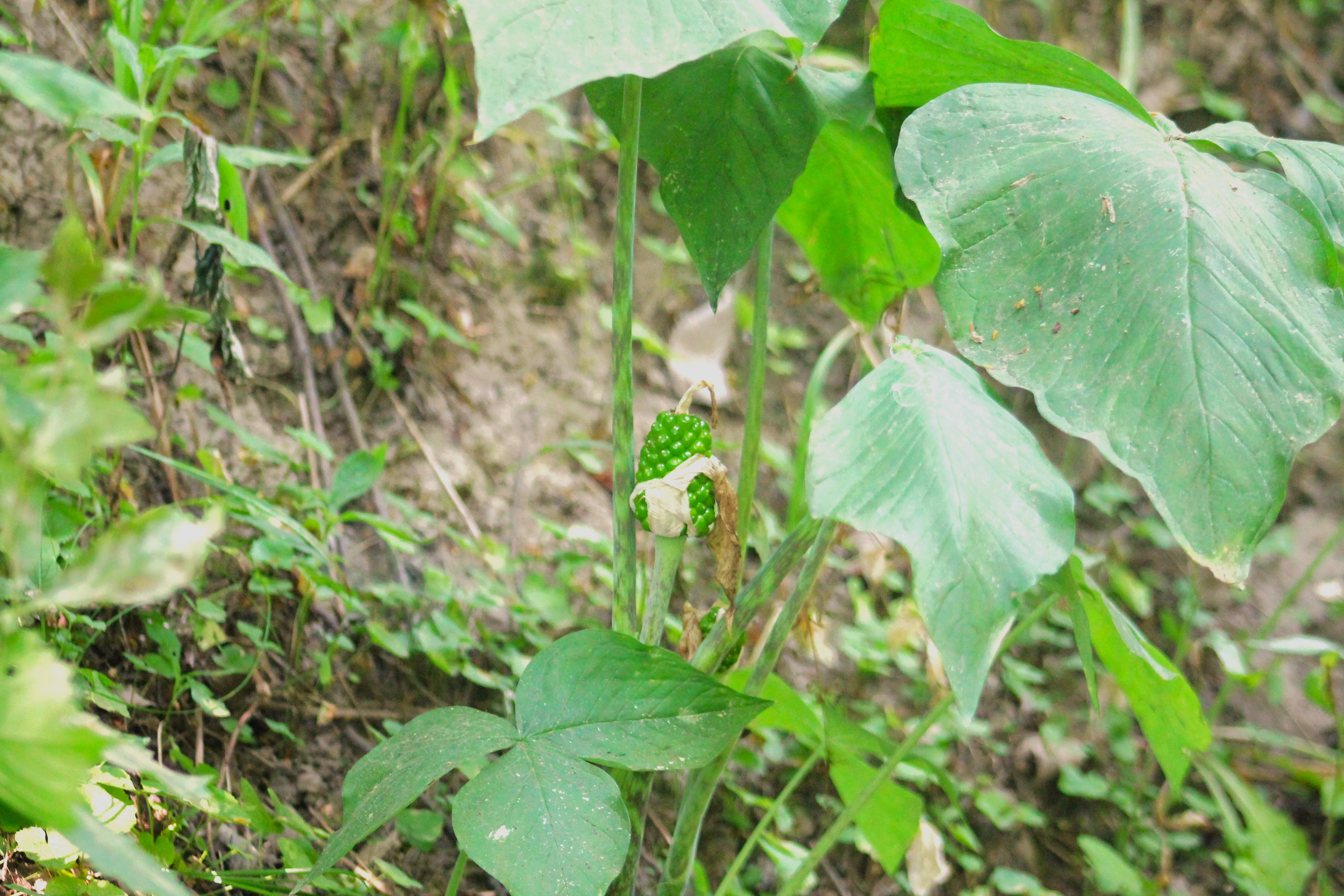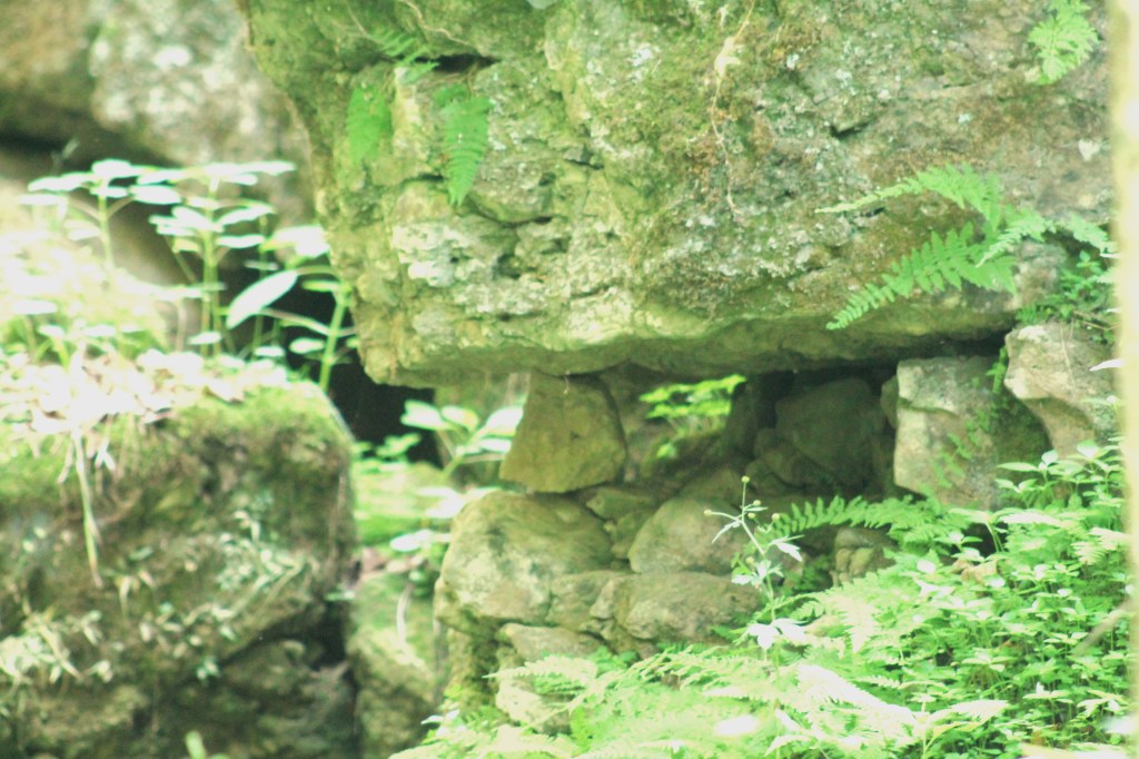 I ambled onward, around the pond to the dike, and down the steep backside of it to the fence line separating the pasture from the woods. A washout, the start of a huge ravine begins in the pasture. I follow it to the fence, and crawl under where it sits higher from the ground. As always, upon entering the woods, I feel a huge load is lifted off from my shoulders, I begin to relax. The only downside to the woods this time of year is that the mosquitoes are thick and ravenous; I hoped with the lack of moisture there wouldn’t be many, although perhaps there would have been many more if it wasn’t a drought. I walked along the pebble strewn, meandering ravine, pausing momentarily to study interesting looking rocks. Jack-in-the-pulpit plants were setting berries, which were still green. Ostrich ferns covered part of the buffside as I passed. The stone foundation sat tucked in among the vegetation on the slope above me, to the right. I ducked under, and scooted over fallen trees and decaying, moss covered logs. I paused at a hole in the side of the hill, briefly wondering who lived inside – a wolf or badger easily could have through the den opening.