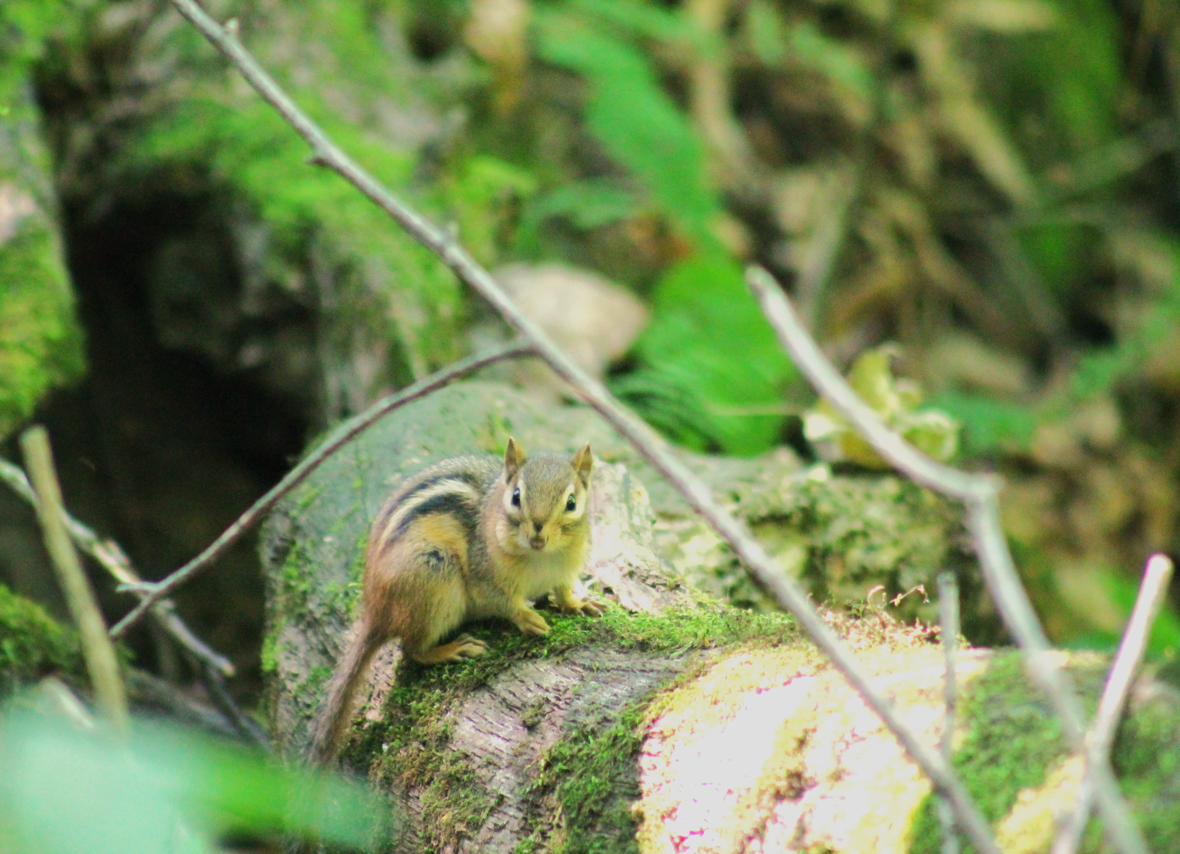 Two deer ran away from me, all I saw was a flash of white. At times the ravine was narrow, though deep, the banks steep; sometimes it was wide and shallow. A dead tree lay across a shallow, wide spot, just before it narrows and plunges down stone steps. I sat on the tree trunk and pulled out my journal to take notes. At the far end of my dead tree, a chipmunk darted about. It sat staring me down for four minutes, with a look of defiance and irritation that I was there. It was not afraid, however. I tried sketching it but quickly became frustrated with my inability to do so well, so I reverted back to my camera – something I can do well. I slid my journal and pencil into my backpack, drank some water, and hopped off the tree, to continue my trek down the huge ravine.