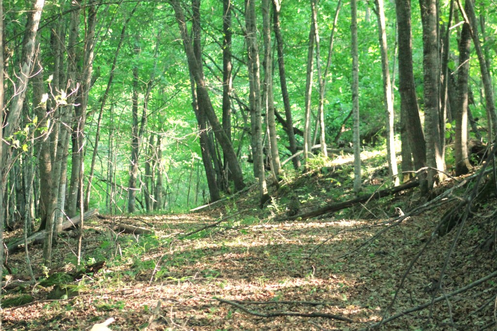 The air is so polluted from Canada wildfires, I can’t tell if it is sunny or cloudy. It is fairly breezy. I arrived in the woods at 3:15 pm. I bicycled along the dead end gravel road, through the pasture, and past the pond. I parked my bicycle at the top of the hill, near the fence line separating the pasture from the field. I trotted down the slope to the other fence line and woods, looking for a place to crawl under the wire. I used to walk over the fence via a boxelder tree leaning over it, but my mother-in-law had cut it. Though I knew the fence needed to be maintained which means cutting up trees that fall on top of it, I was sad to no longer have this bridge into the woods. Also, unlike many farmers, I enjoy boxelder trees. They have spunky character and have more ecological benefits than people realize. I ambled downhill, southward, where the washout entered the woods, feeding the huge ravine. There, I crawled under the fence.