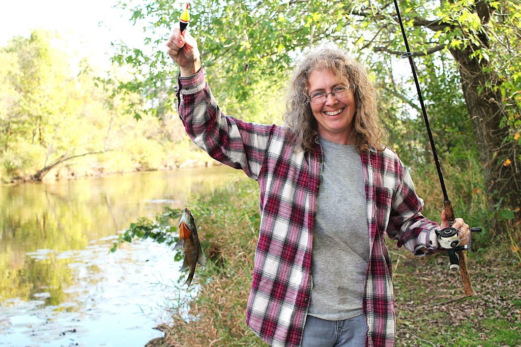 “Good catch, good hook.”Thelma took the fish off the hook and placed it in the bucket with the others. I pulled out a worm to thread on the hook. With further instruction from Thelma, I cast my line. “Perfect,” she approved. “You’ve got a bite…he’s still there. He’s eating that big worm. Now!” I jerked the line trying to hook the fish. “Got him?”