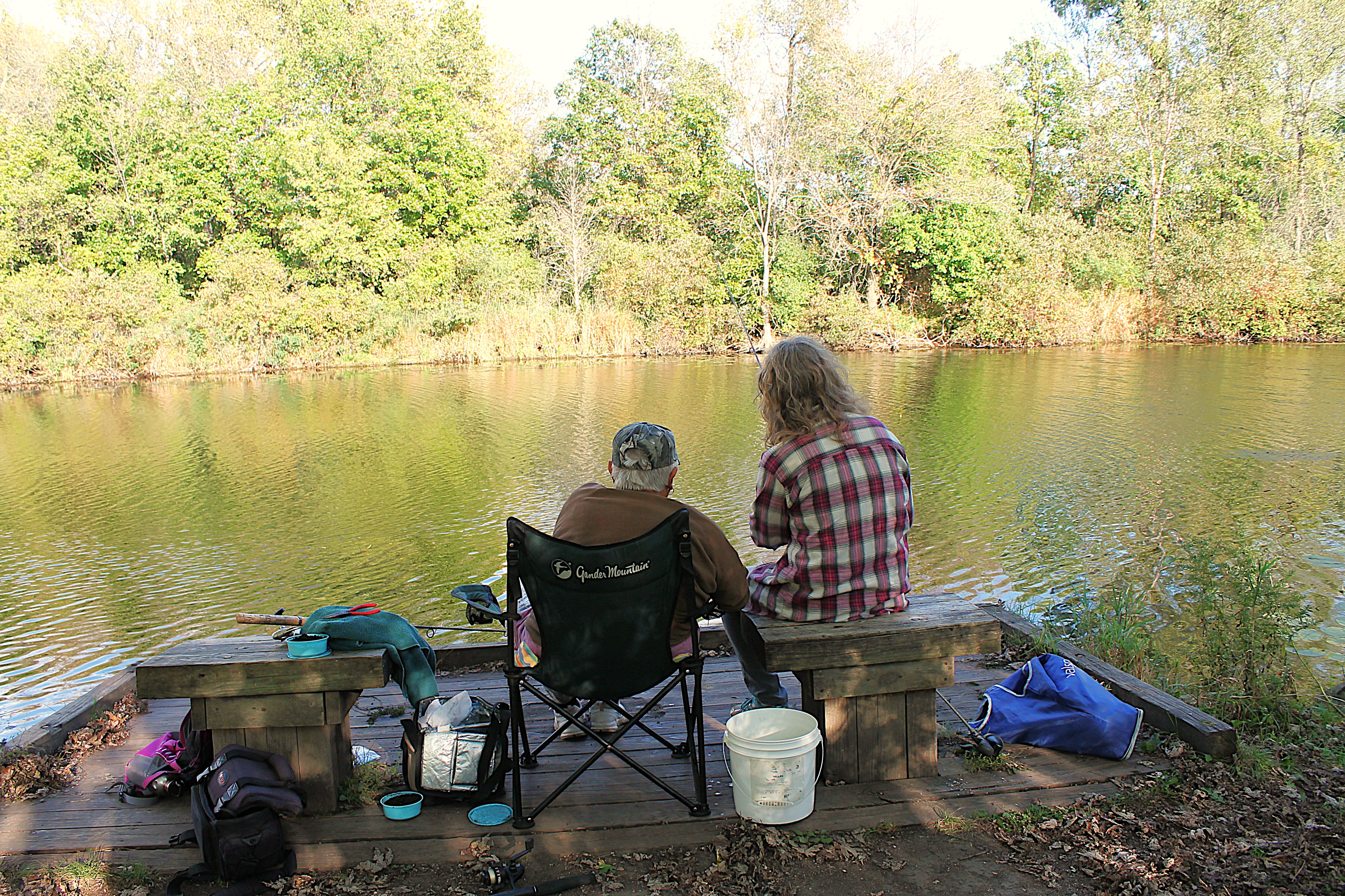 Thelma sat comfortably in a lawn chair on a wooden platform between two identical wooden benches, fishing pole in hand. Her bag of supplies and gear on the ground beside her and next to it a container of red worms. On her right side, a little behind her sat a small white pail. She wore faded camo pants, a pale purple sweatshirt and a baseball cap. We came up beside her, Mom going over to the bench on her right. I set my backpack and camera bag down and the container of worms on the bench to the left.
