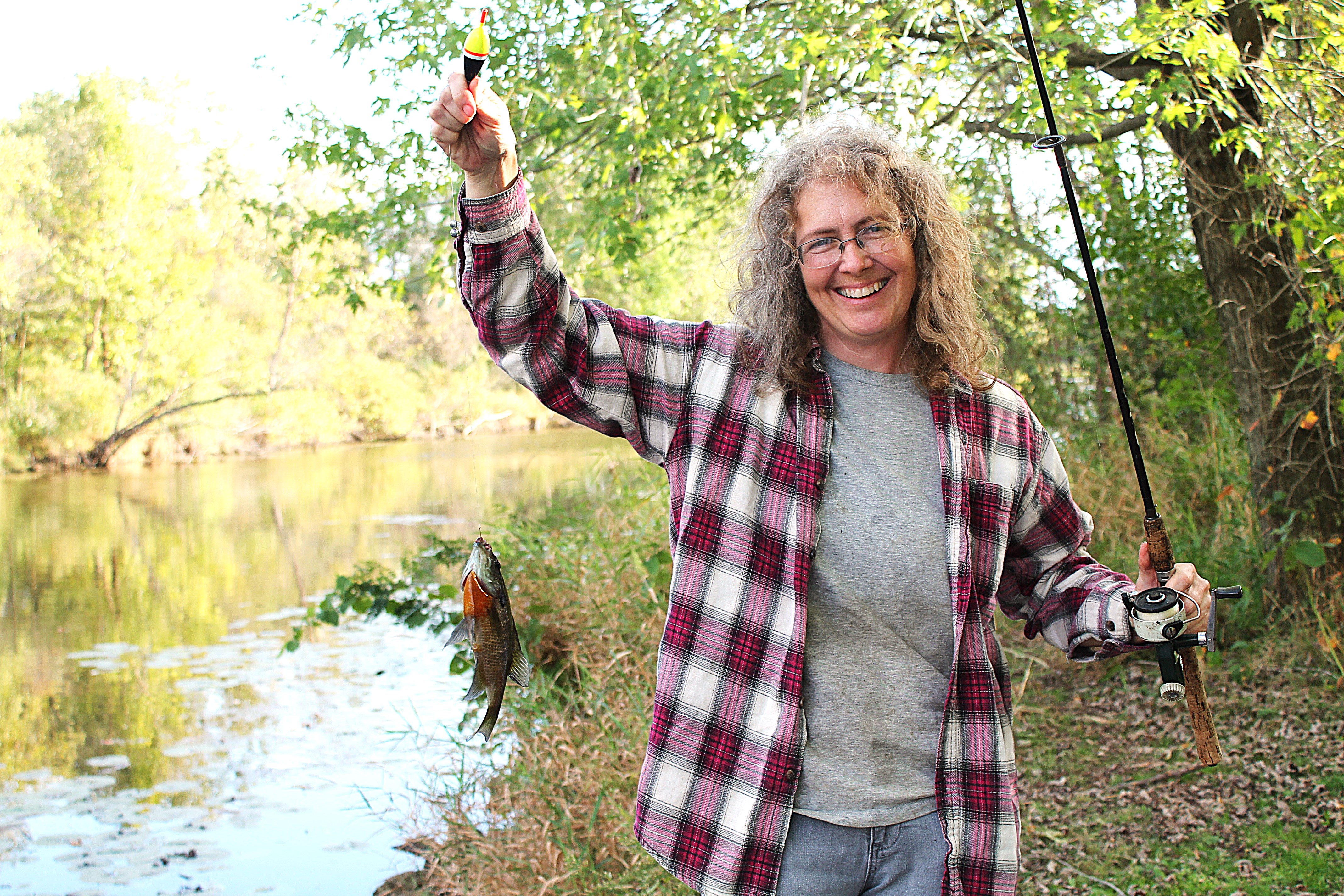 “Ok, watch. I’m going to crank my line up, so I find, when I’m looking out there and get a bite, which I have, that I’m ready.” Thelma reeled in the line and pulled up a beautiful sunfish.